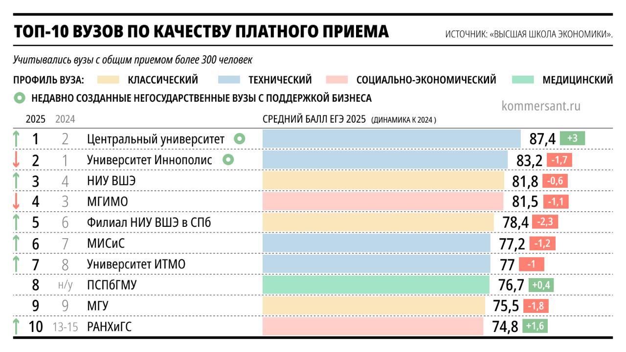 В дополнение к лидерству в платном наборе, Центральный университет также вошел в тройку лидеров по общему качеству набора, что является еще одним подтверждением его высокого статуса. Этот успех ставит университет в один ряд с ведущими образовательными учреждениями страны, такими как Иннополис, НИУ ВШЭ, ИТМО, МГУ и другими.